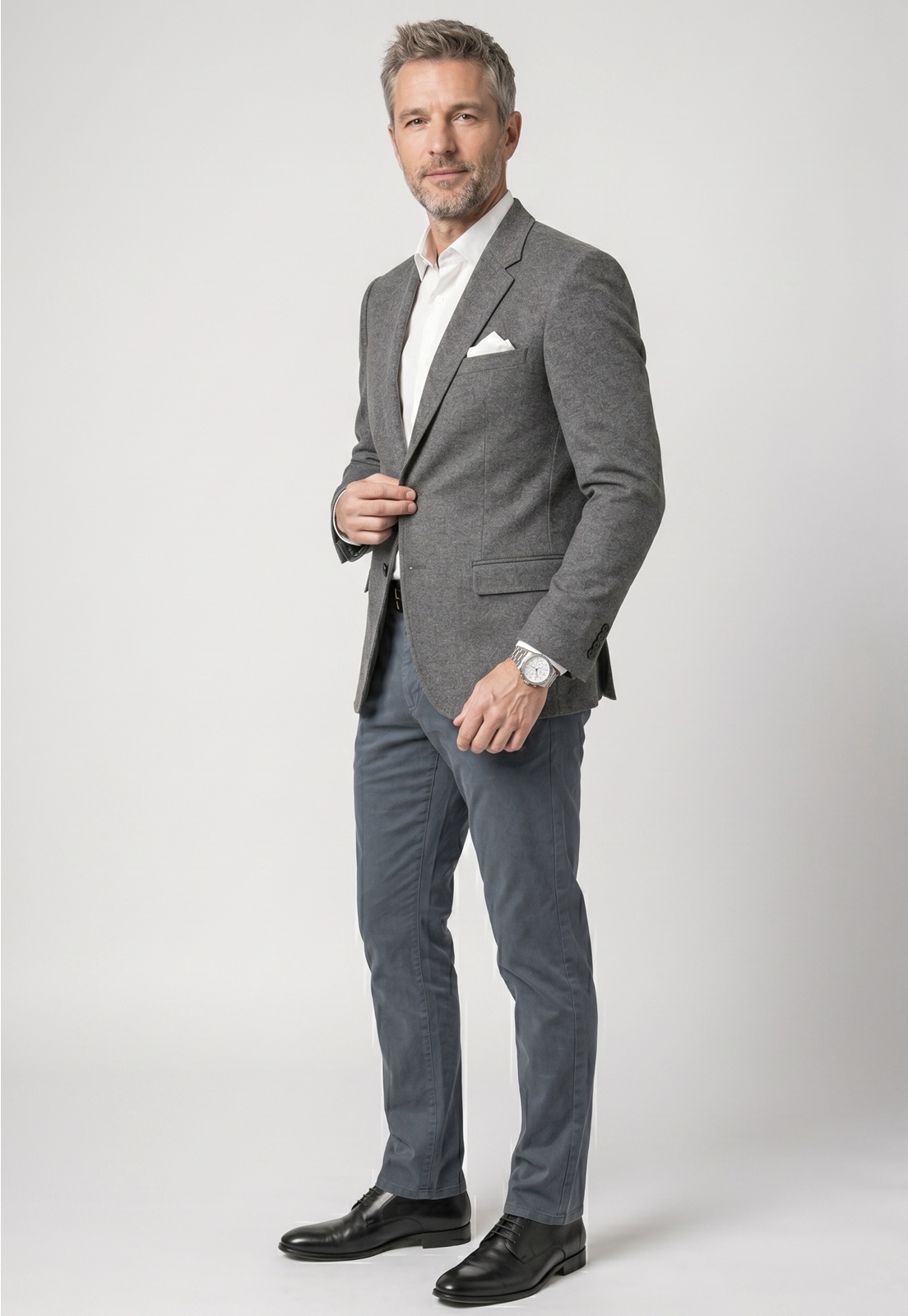 O resultado é um “Smart Blazer”. Visulamente, ele entrega o corte preciso, a lapela bem desenhada e a seriedade do preto profundo. Mas ao vestir, a malha cede e acompanha cada movimento do seu corpo. É a peça definitiva para longos voos, dias intensos de trabalho e jantares de negócios, entregando uma experiência de uso tão confortável que você vai esquecer que está vestindo alfaiataria.