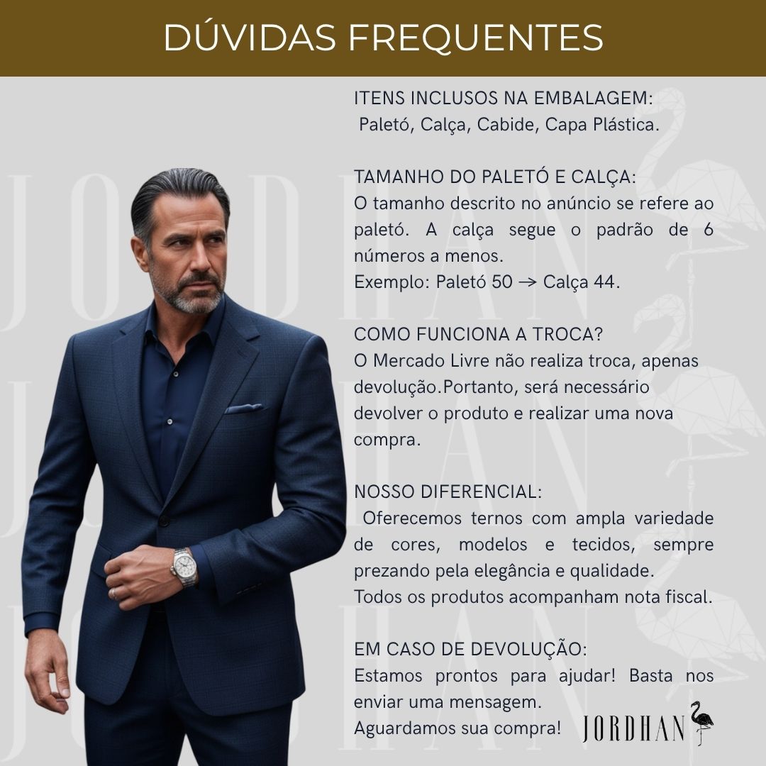 Diferenciais: Caimento slim que valoriza a silhueta; menor propensão a amassados; acabamento de alta alfaiataria; bolso interno funcional; forro com detalhe de assinatura Jordhan