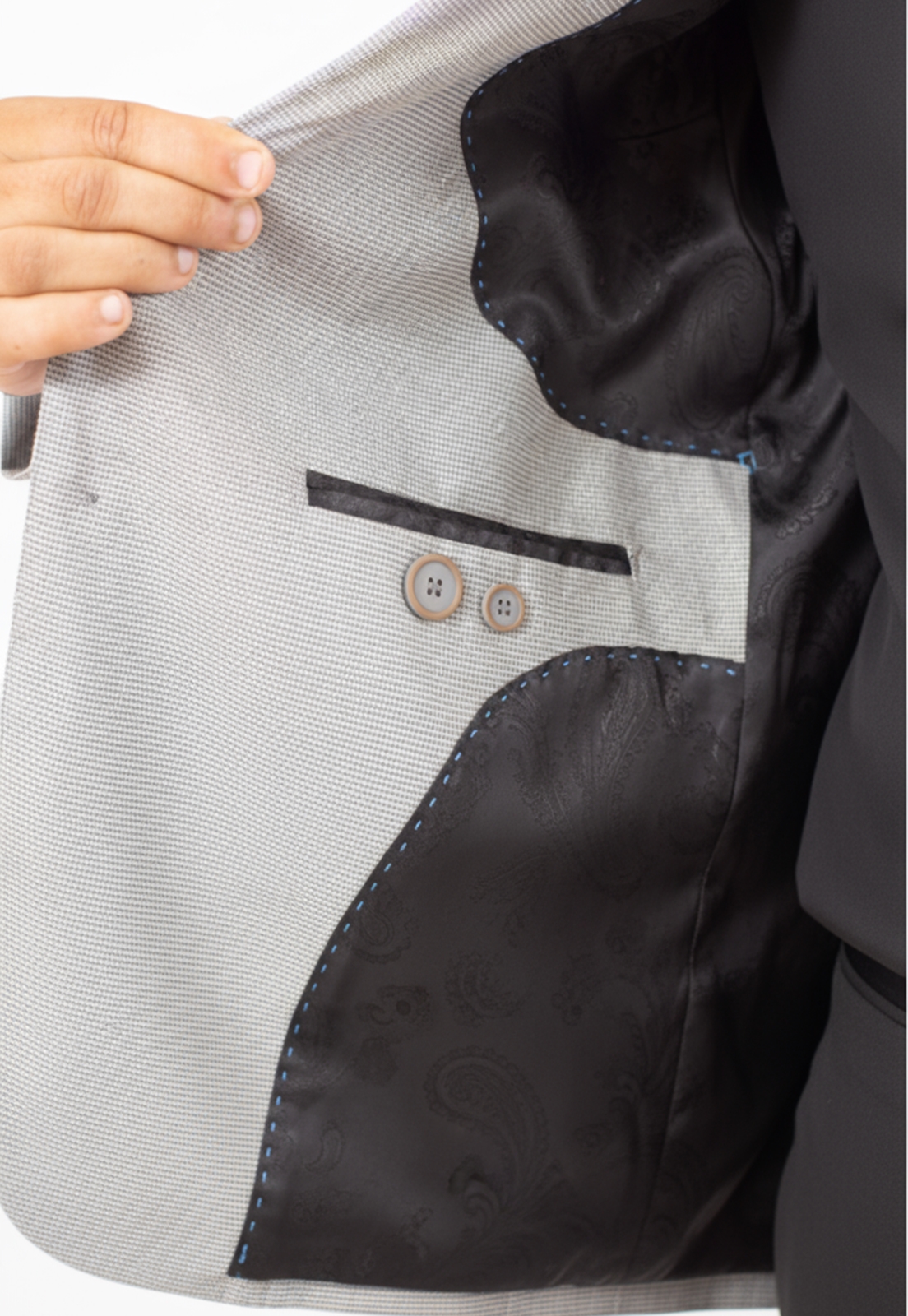 Acabamento premium: forro acetinado com detalhe paisley e pesponto contrastante; botões e costura de alfaiataria.